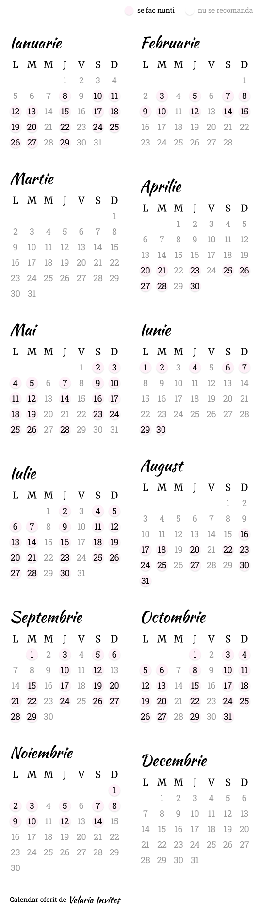 Dacă ar fi să rezumăm, cele mai bune perioade pentru organizarea nunții sunt acelea care evită posturile religioase și care oferă stabilitate din punct de vedere al vremii. În ambele ani, intervalele dintre aprilie și octombrie oferă suficiente opțiuni pentru a găsi data potrivită.